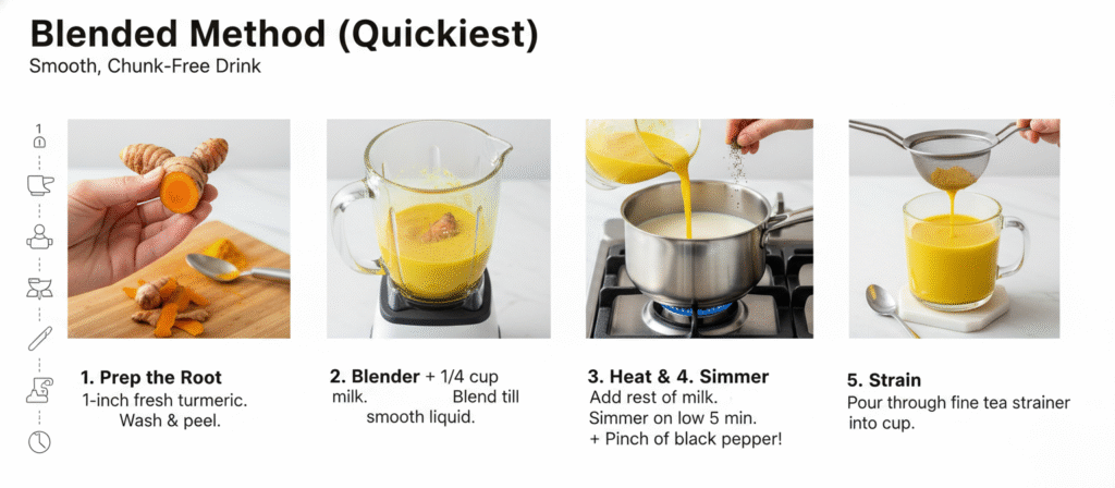 2. Blend: Put the peeled turmeric into a blender with a little bit of your milk (about 1/4 cup). Blend until it is a smooth, bright yellow liquid.